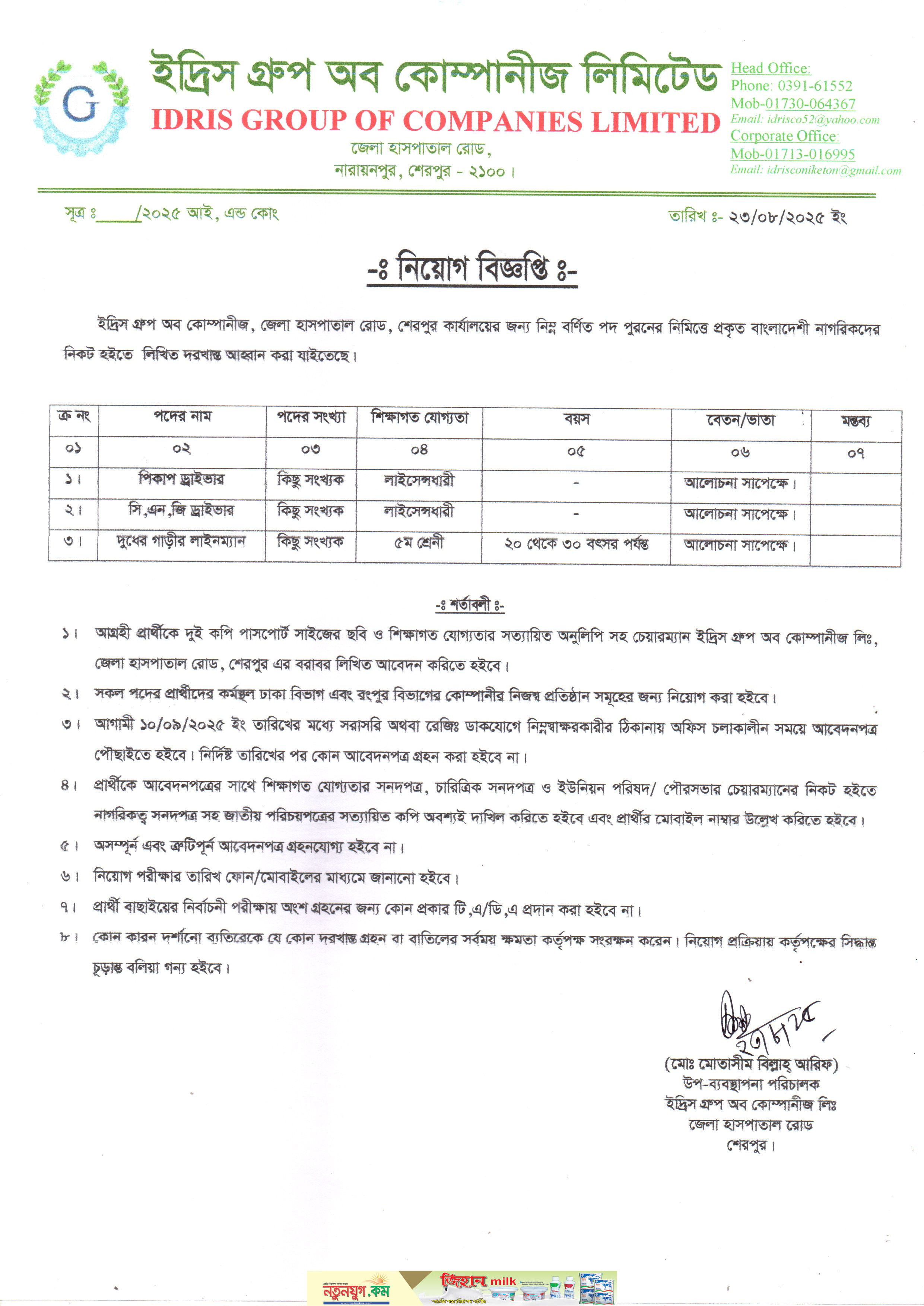 ইদ্রিস গ্রুপ অব কোম্পানীতে নিয়োগ