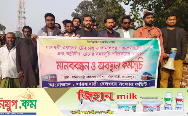 ধলেশ্বরী এক্সপ্রেস ট্রেন চালু, জামালপুর এক্সপ্রেস ট্রেনের রুট এবং অগ্নিবীনা ট্রেনের সময়সূচির পরিবর্তনের দাবিতে মানববন্ধন ও অবস্থান কর্মসূচি পালন করা হয়েছে। শুক্রবার (২৩ জানুয়ারী) বিকেলে সরিষাবাড়ী রেলওয়ে সংস্কার কমিটির উদ্যোগে এ কর্মসূচি পালিত হয়েছে।